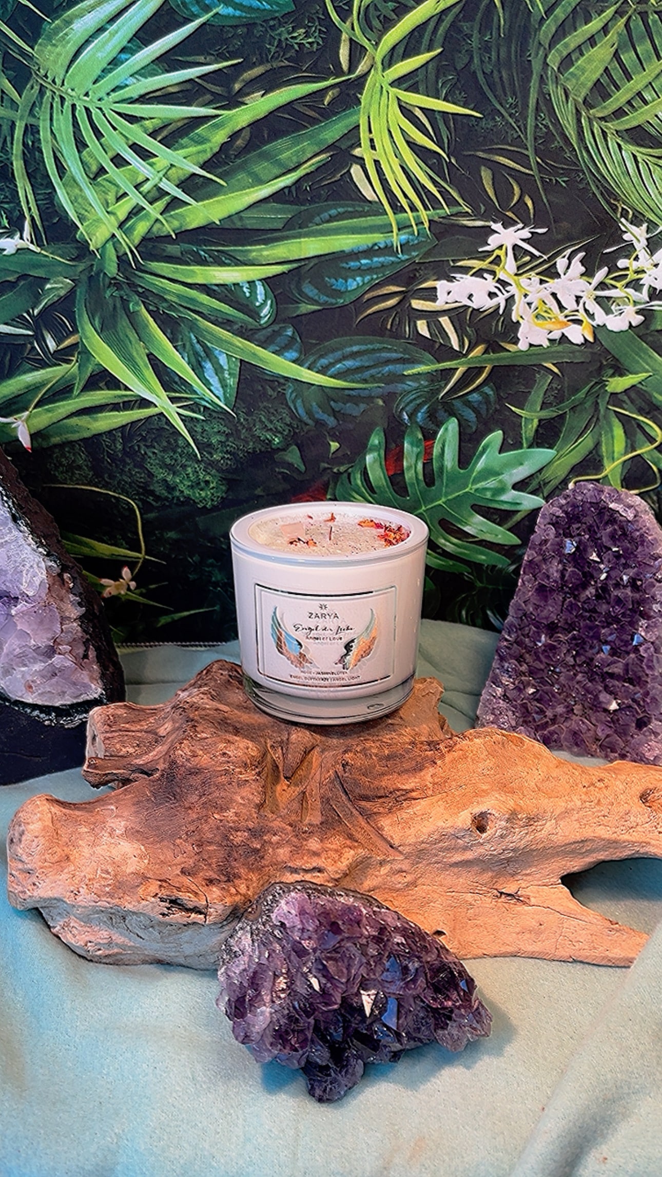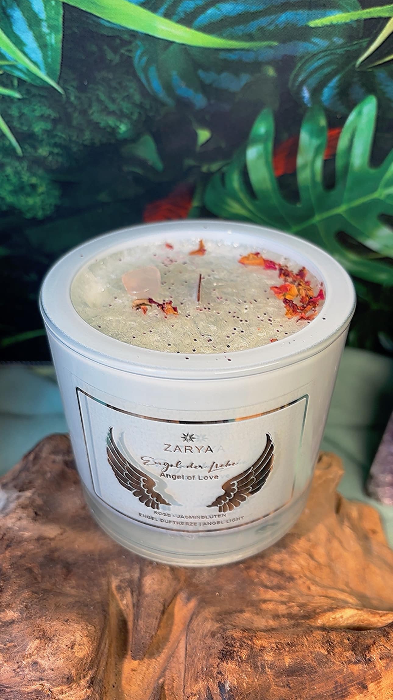 Engelkerze kaufen, Rosenquarz Kerze, spirituelle Kerze Liebe, Duftkerze Rose Jasmin, Heilkerze mit Edelstein, Herzchakra Kerze, Zarya Kerze Deutschland, Holzdocht Kerze, Selbstliebe Ritual Kerze